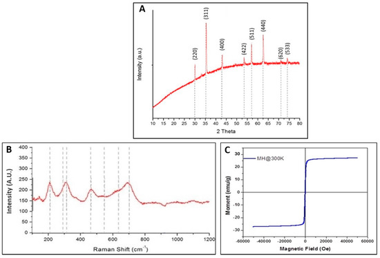 (A) X-Ray diffraction (XRD) pattern for the Mg-ferrite nanoparticles; (B) Raman spectra for the Mg-ferrite nanoparticles; and (C) Magnetization curve of Mg-ferrite nanoparticles.
