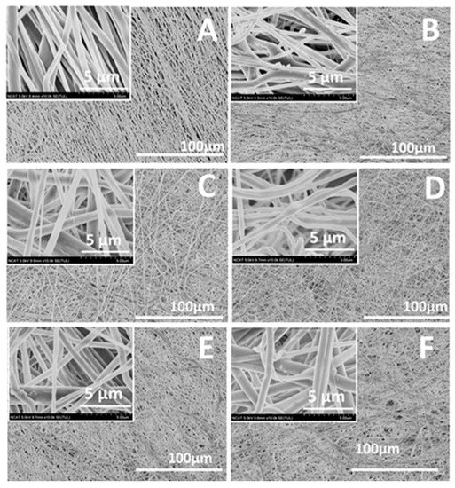 Scanning electron microscopy (SEM) images of magnetic polycaprolactone (PCL)/Aloe vera nanofibers containing (A) 0%; (B) 5%; (C) 10%; (D) 15%; (E) 20%; and (F) 25% Mg-ferrite nanoparticles. Insets show a higher magnification of each corresponding micrograph.