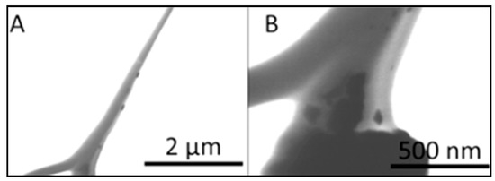 Scanning transmission electron microscopy (STEM) images of magnetic PCL/Aloe vera nanofibers containing 25% Mg-ferrite nanoparticles. Images were captured at (A) lower magnification and (B) higher magnification.