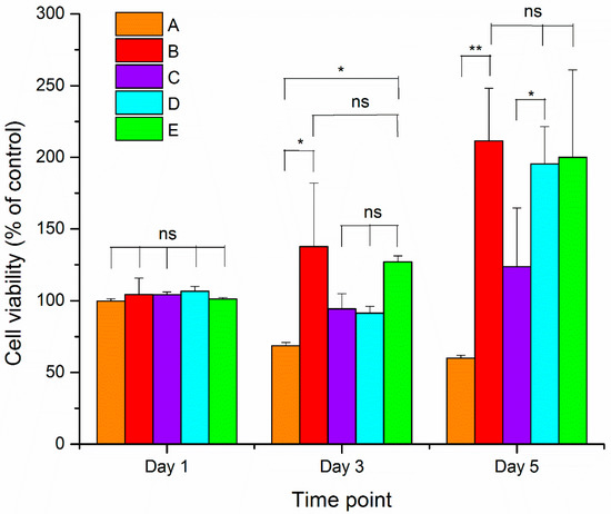 Cell viability results of 3T3 cells grown on Mg-ferrite based PCL/Aloe vera fibers. A and B represent the 100:0 and 70:30 PCL/Aloe vera fibers with 0% Mg-ferrite nanoparticles, respectively. C, D and E represent 70:30 PCL/Aloe vera fibers containing 5%, 15% and 25% Mg-ferrite nanoparticles, respectively. Cell viability data were analyzed for statistical significance using paired t-test (n = 3). A statistical significant of p < 0.05 is indicated by * and p < 0.005 by **. Statistical insignificant of p > 0.05 is indicated by ns.