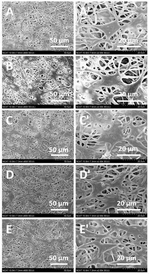SEM images displaying the morphology of 3T3 fibroblast cells seeded on Mg-ferrite based PCL/Aloe vera nanofibers after three days of cell seeding. (A,B) represent 100:0 and 70:30 PCL/Aloe vera nanofibers with 0% Mg-ferrite nanoparticles, respectively. (C–E) represent 70:30 PCL/Aloe vera fibers containing 5, 15, and 25% Mg-ferrite nanoparticles, respectively. Images (A’–E’) are higher magnification images of (A–E), respectively.
