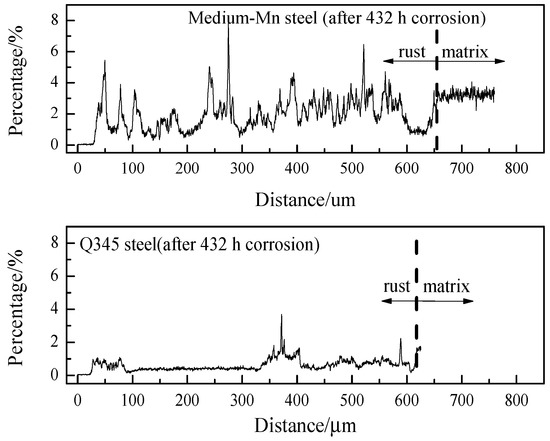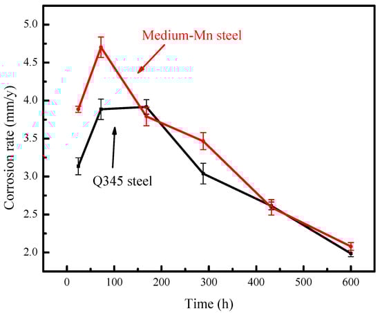 - The two tested steels had similar corrosion behavior. Moreover, the rust morphologies of the Q345 steel were much denser than that of the medium-Mn steel. The corrosion rate was regulated because of the existence of the anti-corrosion elements in the medium manganese steel.
