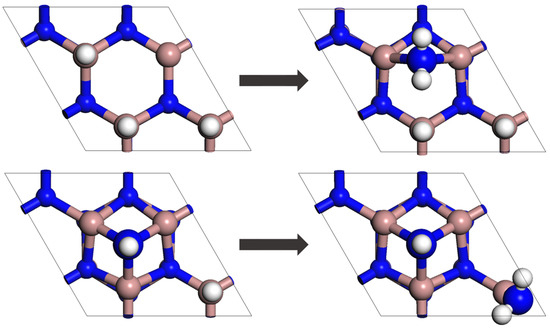Surface structures before and after the chemical adsorption reactions: (upper row) NH3(g) + S[3Ga-H] → H2(g) + S[NH2(br) + 2Ga-H], (lower row) NH3(g) + S[Nad-H + Ga-H] → H2(g) + S[Nad-H + Ga-NH2]. Brown, blue, and white atoms are gallium, nitrogen, and hydrogen, respectively.