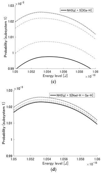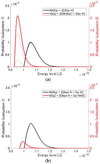 As can be seen in the figure, the probability of subsystem 2 for each system (Figure 2a,b) increases as the state evolves. At the same time, that of subsystem 1 for each system (Figure 2a,b) decreases slightly, although without the change of scale seen in Figure 2c,d, this decrease is difficult to observe. Thus, the probability flows from subsystem 1 to subsystem 2 for each system as the chemical adsorption of ammonia occurs. In terms of the difference in the ground energy between subsystems, that for the adsorption on 3Ga-H is larger than that for the adsorption on Nad-H + Ga-H. This is the principal difference between the two adsorption systems and results in more ammonia adsorption on 3Ga-H than Nad-H + Ga-H. This is not because the probability flows towards lower energy eigenlevels but because the probability scatters to increase the entropy of the whole system.