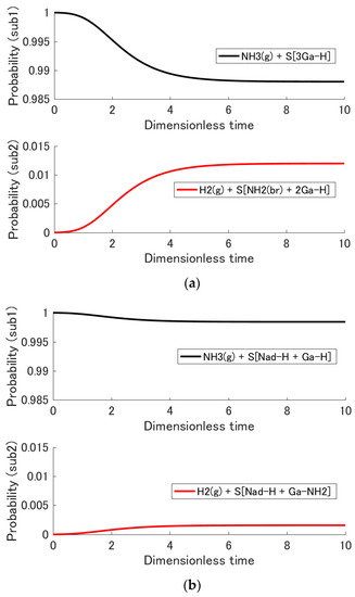 Although the probability distribution is the raw information of state as shown in Section 3.1, in the case of hypoequilibrium state evolution, the two thermodynamic properties and provide additional useful state information as can be seen from Equation (15). The former, the total probability evolution of each subsystem, is discussed here, while the latter, the subsystem temperature, is discussed in Section 3.3. Figure 3a,b shows the subsystem probability evolution for each adsorption system. At the initial state, the total probability of subsystem 1 is 0.99999 and the total probability of subsystem 2 is 0.00001 as mentioned in Section 2.3. During state evolution, decreases and increases based on the principle of SEA. At the equilibrium state, reaches 0.0120 and 0.0016 for the adsorption of NH3 on 3Ga-H and on Nad-H + Ga-H, respectively. In other words, ammonia is adsorbed on 3Ga-H approximately 7.5 times as much as on Nad-H + Ga-H. The sticking coefficient of ammonia on a GaN surface is reported in the literature to be 0.04 [49]; and it is this figure, which is used in GaN MOVPE models [50,51]. The value of in the present study (i.e., 0.0120) is the same order of magnitude as the coefficient value found in the literature, although an exact comparison between these two properties cannot be made because the reconstructed surfaces in this paper are different from those in the literature.