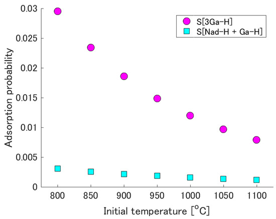 To investigate the dependence of these equilibrium adsorption probabilities on initial temperature, the initial temperature is varied from 800 °C to 1100 °C. Figure 4 shows the equilibrium adsorption probability as a function of initial temperature. The decrease in this probability at higher initial temperatures is a reasonable tendency. The difference between the two equilibrium adsorption probabilities (i.e., that for each of the two reconstructed surfaces) becomes more significant at lower initial temperatures, and the difference at 800 °C is approximately one order of magnitude.