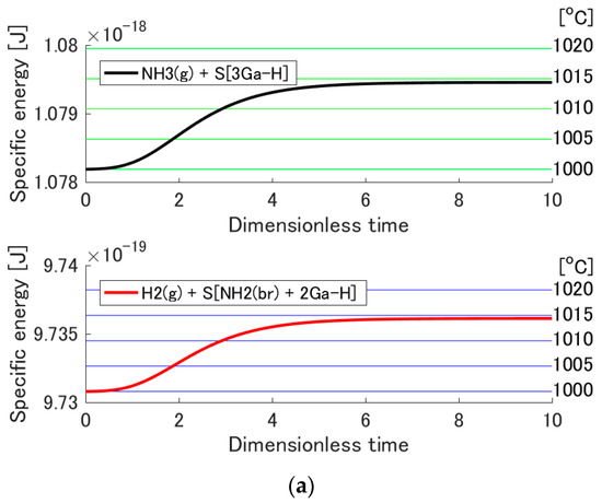 is shown in Figure 5. As can be seen, this energy increases with system temperature. Figure 5 also shows the horizontal lines, which correspond to the specific energies at 1000, 1005, 1010, 1015, and 1020 °C (green lines for subsystem 1, blue lines for subsystem 2, and increasing temperature from bottom to top). By comparing the specific energy evolution of each subsystem with these horizontal lines, one can observe the temperature evolution of each subsystem. The temperature at equilibrium for adsorption onto 3Ga-H is estimated to be approximately 1015 °C because the black (or red) curve almost overlaps with the fourth green (or blue) line from below. The temperature at equilibrium for adsorption onto Nad-H + Ga-H is estimated to be approximately 1000 °C because of the position of the black (or red) curve relative to the first green (or blue) line from below. For adsorption onto Nad-H + Ga-H, the temperature increase is insignificant because the adsorption probability is quite small. However, for adsorption onto 3Ga-H, the temperature increase is much more important.