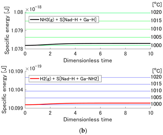 Evolution of the specific energy of each subsystem as a function of the dimensionless time for the adsorption reactions on (a) S[3Ga-H] and (b) S[Nad-H + Ga-H]. Green and blue horizontal lines correspond going from bottom to top to the specific energies at 1000, 1005, 1010, 1015, 1020 °C.