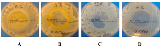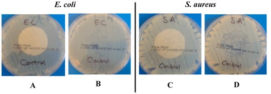 Effect of control samples on the growth of E. coli during (A,C) and following (B,D) incubation; A = no inhibition zone; B = heavy growth under sample and S. aureus; C = no inhibition zone and D = heavy growth under sample. Note: all samples were 3 cm in diameter.