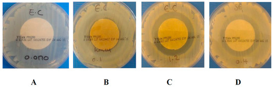 As shown in Figure 1A,C, no zone of inhibition was apparent with the control samples when tested against both gram-negative E. coli and gram-positive S. aureus. Upon the removal of the control samples from the surface of the agar, the contact zone between the sample and the agar presented heavy bacterial growth (Figure 1B,D). This confirms that the control samples did not exhibit any antibacterial activity. Whilst these observations appear to be in contrast with the results provided in Table 2, it is important to note that in this case, the samples were directly tested in contact with inoculated agar gels in the absence of simulated wound exudate solution (in contrast to the case of the assay results provided in Table 2). Here, the bacteria-detrimental fibre-induced water uptake effect was largely marginal, so that high growth of S. aureus was consequently still observed following application of the nonwoven control sample. The antibacterial effect of the MH and MGO coatings having equivalent MGO concentrations between 0.0054 mg cm−2 and 0.0170 mg cm−2 showed no zone of inhibition for E. coli and S. aureus. Upon the removal of the MH coated samples from the agar, heavy growth was apparent at an MGO concentration of 0.0054 mg cm−2 for both E. coli and S. aureus (Figure 2A displays an example of heavy growth). Moderate growth was achieved for both E. coli and S. aureus, upon the removal of the MGO-coated nonwovens at equivalent concentrations (an example of moderate growth is shown in Figure 2B). At an MGO concentration of 0.0170 mg cm−2, moderate and heavy growth was observed for E. coli and S. aureus respectively for the MH-coated samples. However, for the MGO coatings with an equivalent MGO concentration of 0.0170 mg cm−2, no growth and slight growth was evident against E. coli and S. aureus, respectively (examples of slight growth and no growth are shown in Figure 2C,D). These initial evaluations at a concentration of 0.0054 mg cm−2 suggest that an insufficient antibacterial effect was achieved for both MH and MGO coatings. At a concentration of 0.0170 mg cm−2, limited efficacy was observed for the MH coatings. However, for the MGO coatings with an MGO concentration of 0.0170 mg cm−2, the antibacterial effect was shown to improve slightly and a good antibacterial effect and a limit of efficiency was achieved for both E. coli and S. aureus respectively.