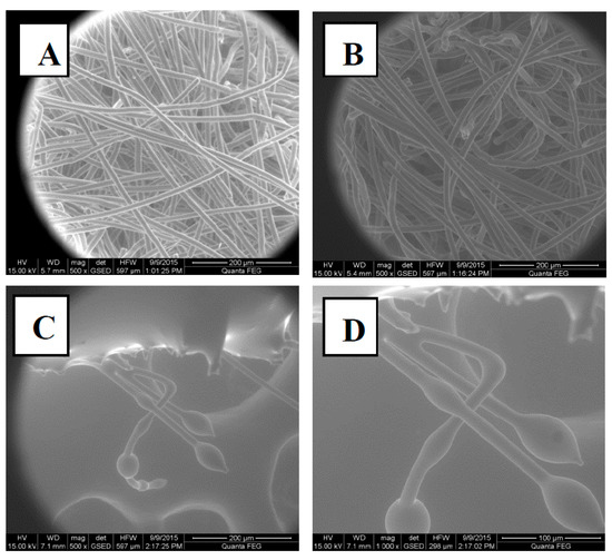 FEGSEM of dry TENCEL® fibres (A), synthetic MGO-coated fibres (B) and MH-coated fibres (C,D) taken at a magnification of 500× (A–C) and 1000× (D). The concentration of MGO on both the MGO- and MH-coated samples was 0.1 mg cm2. The diameter of the uncoated TENCEL fibres ranged between 10 and 15 µm. The MGO-coated fibres ranged from 10 µm to 25 µm (this is due to the swelling of the TENCEL fibres after coating).