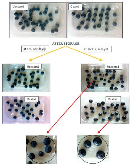 As so far, there are a few works about coating effects on blueberry fruit. According to this research, edible coatings such as chitosan, starch, pectin, sodium alginate, and calcium caseinate have exhibited beneficial roles in maintaining quality of berries. Coating has been successfully used to controlling the decay and extending the shelf life of postharvest blueberries. Furthermore, the use of coating had positive effects on weight loss, firmness, titratable acidity; maintained surface lightness; and delayed the decrease in anthocyanin content, phenolic content, and antioxidant capacity of coated fruit products [13,15,16,17].