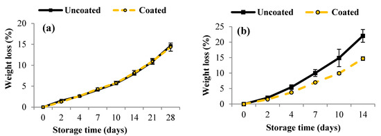 Weight loss of uncoated (C) and coated (P) blueberries storage at 4 °C for 28 days (a); and 16 °C for 14 days (b). Error bars represent the standard deviation. Values are means of three (n = 3) replications.