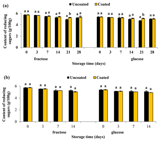 Reducing of sugar (fructose and glucose) content in uncoated and coated blueberries during storage at 4 °C for 28 days (a); and at 16 °C for 14 days (b). Error bars represent the standard deviation. Values are means of three (n = 3) replications. Means with different letters amongst different treatments for the same time are significantly different according to Tukey’s test (p < 0.05).
