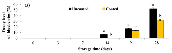 Effect of pullulan coating on the rate of decay in blueberries during 28 days of storage at 4 °C is presented in Figure 5. In general, the percentage of blueberries showing the signs of decay was lower in the coated fruits than that of uncoated fruits during the storage period. Until day 7 of storage, uncoated as well coated fruits showed good signs of hydration and color, and signs of decay in samples were not observed. Decay and contamination of fruit first appeared on uncoated samples on day 14. At day 21, the percentage of decay of coated blueberries was 13.70%, which was still significantly less (p < 0.05) than that of uncoated samples 17.04%. After 28 days of storage, the percentages of fruits showing signs of decay in uncoated and coated fruits were 52.22% and 32.22%, respectively. Similar results were observed at a storage temperature of 16 °C (Figure 5). The percentage of fruits showing signs of decay in pullulan-coated fruits was significantly less (p < 0.05) than that of uncoated fruits throughout the storage period. At day 14, the percentage of blueberries coated with pullulan was 27.04% and was still significantly less (p < 0.05) than that of uncoated fruits (58.89%).