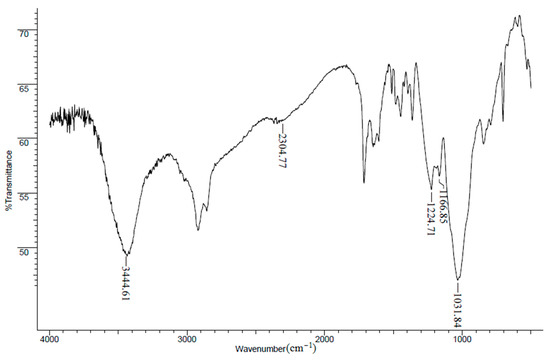 Reaction of polyols with DECP is known to give neutral phosphate esters [14]. The optimum procedure for directly preparing the monoprotic ligands was determined to be phosphorylating the polyols with DECP in pyridine containing 10% DMAP. Monoesters have been prepared with DMAP [15]. pEG1M, pGlyM, and pPenatM all have nearly equal acid and phosphorus capacities (Table 1), indicating that they consist of monoprotic phosphoric acid groups. As expected, DPA has an acid to phosphorus ratio of 2:1. The theoretical phosphorus capacities of monophosphorylated glycol, glycerol, and pentaerythritol are 3.36, 3.04, and 2.67 mmol/g, respectively; the experimental values for the latter two are within experimental error of theory, while the value for pEG1M is lower by 0.5 mmol/g. The FTIR spectrum of pPentaM is representative with the hydroxyl band at 3400 cm−1 and the acidic –OH at 2300 cm−1 (Figure 2). The P=O band appears at 1265 cm−1 in the diethyl phosphate and its conversion to the monoprotic pPentaM shifts the P=O band to 1224 cm−1. The significance of the shift will be discussed.