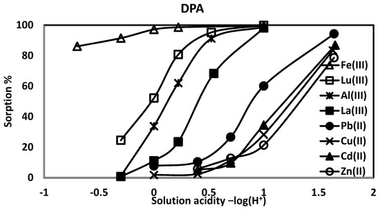 The DPA affinities for divalent and trivalent ions are summarized in Figure 4. Over a range of solution acidities, DPA shows an order of Fe(III) > Lu(III) > Al(III) > La(III) > Pb(II) > Cd(II), Cu(II) > Zn(II); the monoprotic phosphates have nearly the same sequence: Fe(III) > Lu(III) > La (III) > Al(III) > Pb(II) > Cd(II), Cu(II) > Zn(II). There is a very high Fe(III) affinity which is less dependent on solution acidity, though at 5 M HNO3, more Fe(III) is sorbed by pPentaM (95%) than DPA (86%).