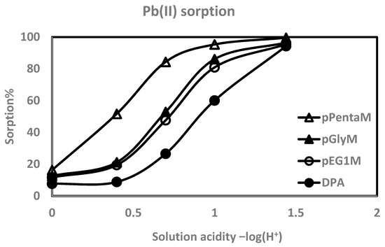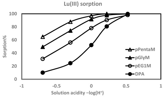 Affinities were quantified by batch equilibration of the polymers with 10−4 M metal ion solutions at varying concentrations of HNO3. All pH values are calculated as the −log of the HNO3 concentrations except for the 0.01 M HNO3 solution used for the divalent ions which was the only one whose value changed from the one calculated (the experimental value is shown). Enough Buchner-dried DPA, pEG1M, pGlyM, and pPentaM to give 0.5 mmol P were shaken with 5 mL of metal ion solution for 17 h after being pre-equilibrated with the appropriate background solutions. Metal ion concentrations were determined by inductively coupled plasma-atomic emission spectrometry (PerkinElmer Optima 7000 DV ICP-AES, PerkinElmer, Waltham, MA, USA). The percent sorption was calculated from metal ion concentrations before and after equilibration.
