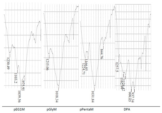 FTIR spectra of monoprotic (pEG1M, pGlyM, pPentaM) and diprotic (DPA).
