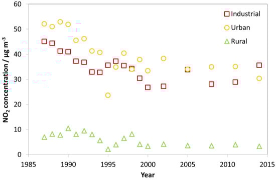 2 at the urban sites was higher than at the industrial sites in nearly all years, with the coincidental main exception being 1995, when only one urban site was included in the average. The higher average concentrations of NO