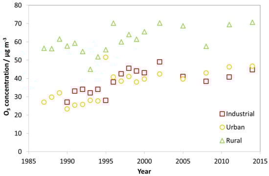 3 measured for the sites were slightly positive, and slightly more so from 1987 to about 2000 than from 2000 to 2014. The average concentration at the rural sites was always significantly higher than that at the urban and industrial sites. The difference between the average concentration at the urban and industrial sites was always small, with alternating ranking between them. In 1995, there was only one urban site in the calculated average, due to changing of sites in the programme, which explains the coincidental high “average” value in this year.