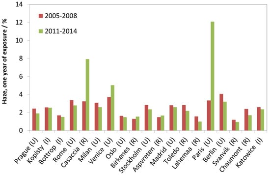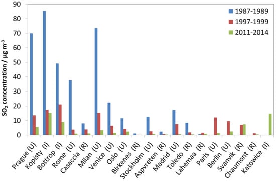 2 at the industrial sites for the whole period of measurements, from 1987–1989 to 2011–2014, was dominated by a decrease in Kopisty, but from 1997–1999 by a decrease in Bottrop. The decrease at the urban sites from 1987–1988 to 2011–2014 was dominated by a decrease in Milan and Prague, with somewhat less decrease in Rome, Venice and Madrid. Since 1997–1999, the decrease was larger in Prague than in Milan and the ranking of the other sites also changed. The decreases at the new sites in Paris and Berlin were higher than in Madrid and Venice. The few measurement values for Rome showed a situation there after 1997–1999 was more similar to that of the low values in Stockholm and Oslo. It can however be noted that a relatively high SO