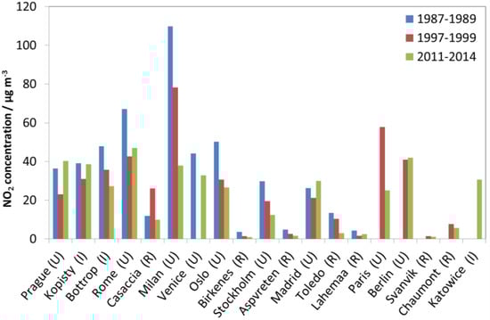 The decreases in measured NO2 in Stockholm and Oslo since 1987–1989, and in Casaccia and Toledo since 1997–1999, as compared to the other sites, were relatively larger for NO2 than for SO2. Among the new sites included from 1997–1999 to 2011–2014, a large decrease in NO2 was measured in Paris.