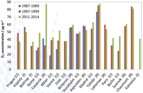 At the sites in Rome and Casaccia, lower values were measured in the mid-1990s, and then considerable increases were measured towards 2011–2014. Significant increases were also observed from 1997–1999 to 2011–2014 for some sites outside of Italy and Spain, for which O3 measurement results then had become available: Berlin, Paris and Bottrop. The changes in O3 showed no clear correlation with changes in NO2 and SO2. The largest variation and overall increase in O3 concentration was measured for the rural site Casaccia. Except for this site, the sites with the largest increases were all urban sites. At the other rural sites, and the urban sites Stockholm and Oslo, small increases or decreases were measured. Exceptions from this were the two Czech sites, the industrial site Kopisty and the urban site Prague, where large decreases were measured from 1997–1999 to 2011–2014.