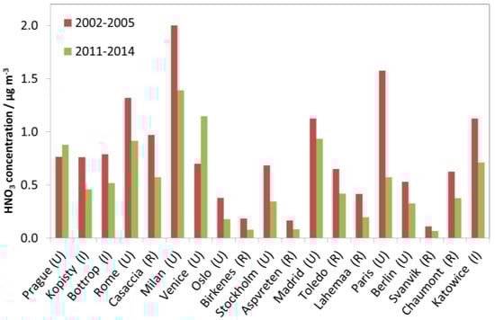 3). Comparing the two periods, the average concentration measured for most sites has decreased. There is considerable variation between the values for the industrial, urban and rural sites, with higher values measured at some rural sites than at the urban and industrial sites. The highest values were measured at the urban sites Paris, Milan, Venice, Rome and Madrid, and the industrial site Katowice. Notably, low values were measured at the rural sites Svanvik, Aspvreten and Birkenes, and at the urban sites Oslo, Stockholm and Berlin. Details on the measurements of nitric acid have been presented elsewhere [