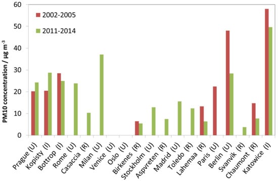 10). It is not possible to make any general conclusions regarding trends based on this limited dataset. Among the urban sites, notably low values were measured at the sites of Stockholm and Madrid. Among the rural sites, the highest concentrations measured overall were in Toledo, and the lowest concentrations were measured in Birkenes and Svanvik. Some sites showed notable trends of decreasing PM