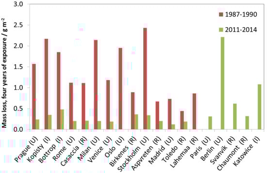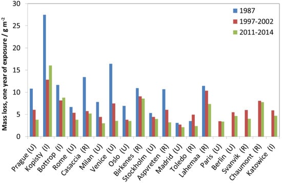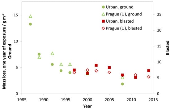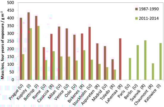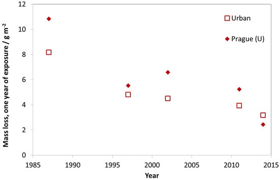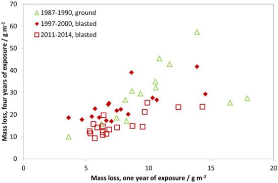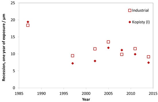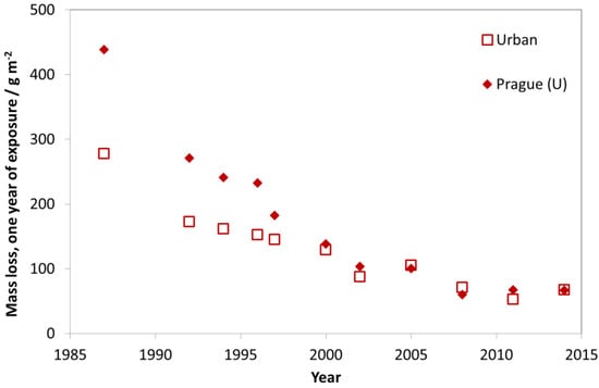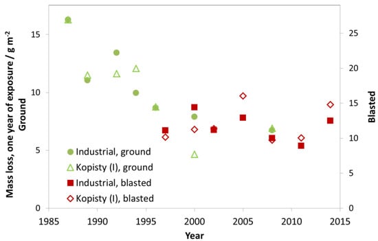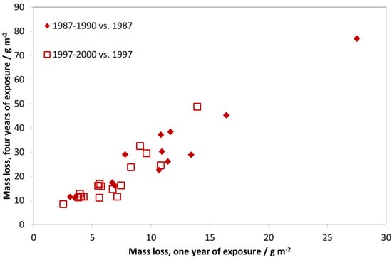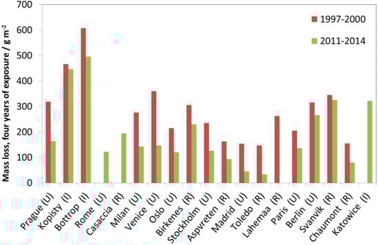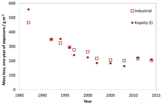 Figure 16, the mass loss after one year for the investigated industrial test sites decreased significantly in the period 1987–1997. From 1997, the value then remained at a constant level (around 10 g/m