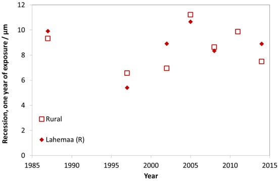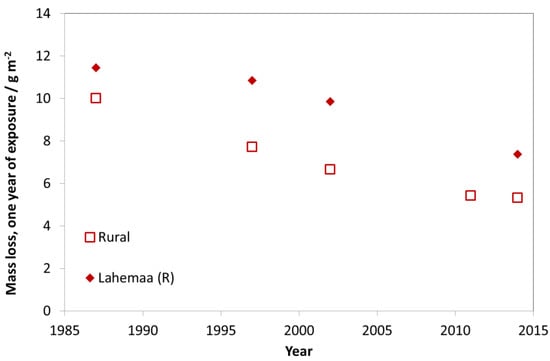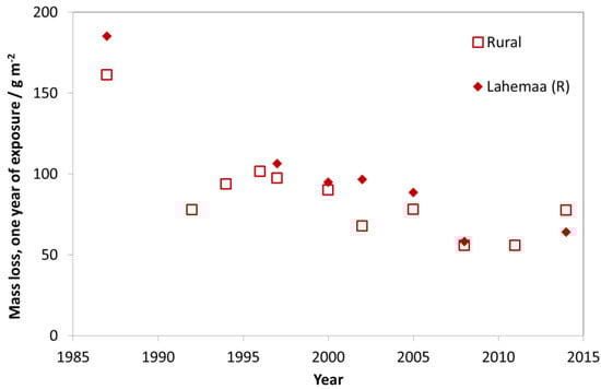 The trend for rural test sites is slightly less distinct compared to industrial and urban test sites. There is a higher fluctuation of mass loss values from year to year. For some rural test sites, a slight decrease of mass loss values can be found but there are other sites, such as Lahemaa (Estonia), with no clear trend (