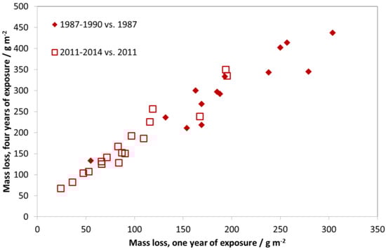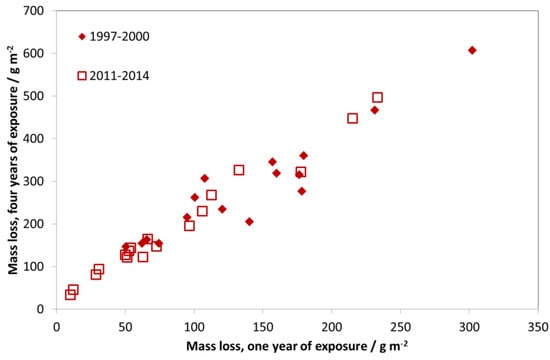 Figure 12 shows the mass loss after four years of exposure vs. mass loss after one year of exposure for two different exposure periods, 1997–2000 and 2011–2014. The clear relationship between one- and four-year periods shows that it is equivalent to show trends in corrosion based on four-year exposures instead of one-year exposures. The advantage of using four-year values for showing trends in corrosion is that it is less sensitive to year-to-year variation in climatic parameters (temperature, relative humidity, and precipitation). The higher corrosion values also make it easier to identify significant trends for individual sites. Note that in