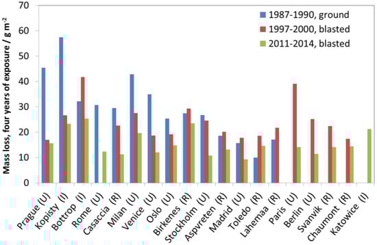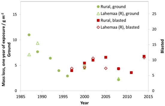 Figure 18). Higher mass loss values were sometimes measured at rural sites compared to urban sites. Overall, the mass loss values (blasted) at most sites now range 5–10 g/m