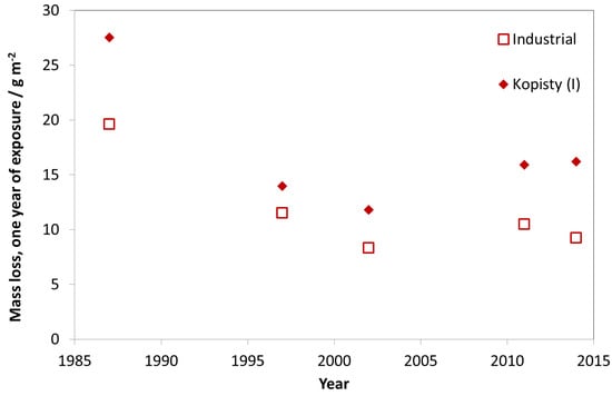 Figure 9 shows the average mass loss of unalloyed carbon steel (C < 0.2%, P < 0.07%, S < 0.05%, Cu < 0.07%) for one-year exposures for industrial test sites with one selected individual site, Kopisty. The corrosion decreased significantly between 1987 and 1997. The corrosion then remained on a level around 240 g/m