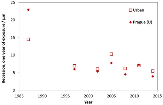 Figure 17, the trend is shown for the nine investigated urban test sites with Prague as a typical example. As for the industrial sites, there is a strong decrease of mass loss between exposure periods 1987–1988 and 1997–1998, but also a small reduction of mass loss in the following periods. Today, the corrosivity category for the urban test sites (C3) is starting to approach C2 with values comparable to those in rural atmospheres.