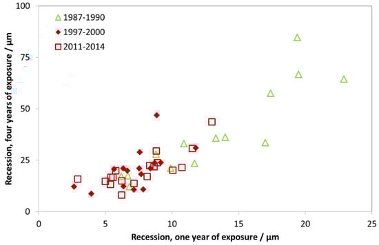 Figure 13 shows trends of four-year corrosion at the test sites and that corrosion has decreased at all sites corresponding to average levels for 2011–2014 of about 60% of those for 1997–2000.