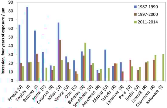 Figure 11). Today, the urban test sites (C4 and C3, according to ISO 9223) are tending towards C2 with values typical for former rural atmospheres. This shows that labels such as “industrial”, “urban”, “rural” and “marine” can be useful for indicating the type of pollution (dominated by SO