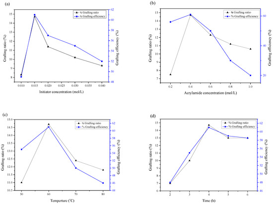 The influences of the synthesis conditions on the grafting ratio and the grafting efficiency of xylan-g-PAM. (a) The influence of initiator; (b) The influence of acrylamide; (c) The influence of temperature; and (d) The influence of temperature.