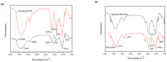 The FTIR spectra of xylan and xylan-g-PAM were given in Figure 2a, and the FTIR spectra of fiber fines and cationic fiber fines were displayed in Figure 2b. In Figure 2a, the absorbance at 3414 cm−1, 2907 cm−1, 1625 cm−1, 1414 cm−1, 1033 cm−1, and 893 cm−1 in the spectrum are associated with xylan [28]. The band at 2907 cm−1 is assigned to the C–H stretching vibration of alkane in xylan. In the spectrum of xylan-g-PAM, the intensities of peak around 3414 cm−1 increased due to the superposition of the stretching vibration absorption peak of –OH and –NH. In contrast, two strong bands around 1671 cm−1 and 1614 cm−1 are attributed to amide-I (C=O stretching) and amide-II (NH bending) [29]. The band around 1383 cm−1 is for the C–N stretching vibrations [29]. These results confirmed that the acryloyl groups were introduced to the xylan chains successfully.
