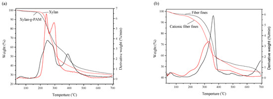 Figure 3 shows the typical TGA/DTA curves of xylan, xylan-g-PAM, fiber fines, and cationic fiber fines. For Figure 3a, the TG curves of xylan and xylan-g-PAM exhibited a three-stage thermal decomposition. The first stage was below 200 °C, indicating on the surface water evaporation. In the range of 200–400 °C, the substantial weight loss of xylan and xylan-g-PAM occurred, which was attributed to the thermal decomposition of xylan, amide side-groups of grafted AM [32]. During this period, the decomposition rate of xylan was faster than xylan-g-PAM, indicating that xylan-g-PAM was thermally more stable than xylan. In the range of 400–700 °C, the TGA curves of xylan and xylan-g-PAM were smoothness. At 700 °C, the residue weight of xylan was higher than xylan-g-PAM due to the little impurity of purchased xylan (some inorganic salt and ash content).