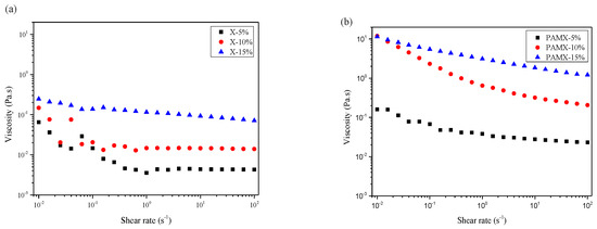 Shear rate dependence of viscosity for xylan (X) (a); and xylan-g-PAM (PAMX) (b) at different concentrations.