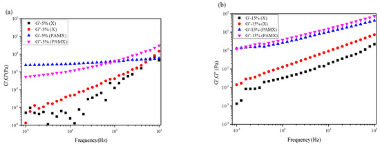 Frequency dependent modulus of the solutions of xylan (X) and xylan-g-PAM (PAMX) at 5% concentration (a); at 15% concentration (b).