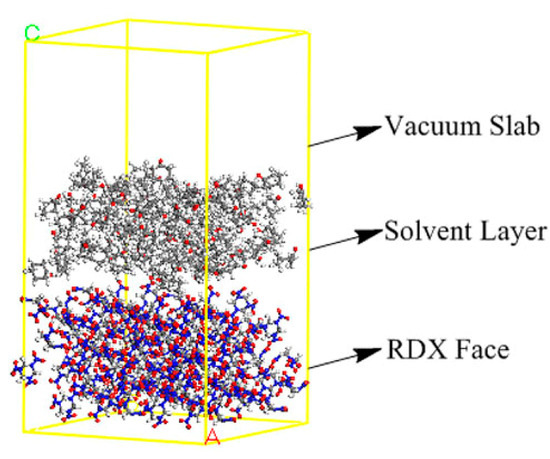 Based on the total energy of double layer construction (Etot), the RDX surface energy (Esurf), solvent energy (Esolv), and interaction energy between the RDX surface and solvent molecules (Eint) can be calculated by Equation (2) [9,10].