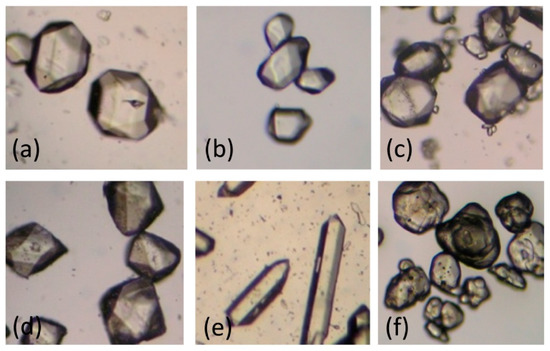 The photos of conventional RDX and RDX crystal from five solvents including acetone (a); cyclohexanone (b); γ-butyrolactone (c); dimethyl sulfoxide (d); and N-methyl-2-pyrrolidone (e) ; conventional RDX (f) respectively.
