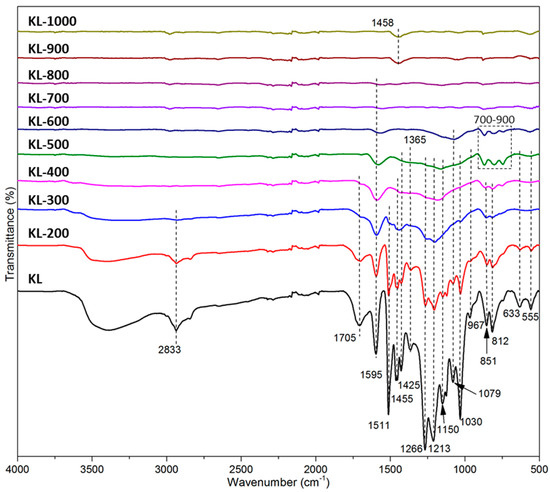 FTIR spectra (Figure 2) show that the reduction of infrared (IR) signals of KL-X samples mainly occurred at the temperature range of 200 to 700 °C. The reduction of IR signals at the temperature range of 200 to 500 °C was significantly higher than that of 500 to 700 °C. This suggested the majority of lignin side chains were decomposed after heated at 500 °C for 2 h. Specifically, the reduction of 1705 cm−1 (corresponding to C=O) [33], 1079 and 1030 cm−1 (both corresponding to aliphatic C–O) bands [34] in the temperature range from 200 to 500 °C can be attributed to cracking and reforming of carboxyl (–COO–), carbonyl (–CO–) [35], and ether (R–O–R) groups. The reduction of IR bands at 3600~3100 cm−1 (corresponding to –OH) [36] and 2860~2939 cm−1 (corresponding to –CHn) [37] at the temperature below 400 °C resulted from lignin dehydration and decomposition of aliphatic chains [38]. Besides, the reduction of 633 and 555 cm−1 IR bands at the temperature below 300 °C was related to the decomposition of sugar (hemicellulose) impurities. All IR bands for aliphatic chains (1079 cm−1), methoxyl (1425 cm−1), and aromatic-bonded oxygen (1266, 1365 cm−1) groups [34,39] were considerably reduced as temperature increased to 500 °C. The decreases of aromatic C=C stretch and C–H deformation at 1595 cm−1 and 1150 cm−1, respectively [40], indicated the increase of aromatic condensation degree [41]. However, the high intensity between 700~900 cm−1 appeared the spectrum of KL-500 suggested the formation of volatile tars on the solid carbon surface at 500 °C [19]. The intensity of IR band at 700~900 cm−1 decreased with the rise of temperature from 500 to 700 °C indicated the secondary pyrolysis of tars [35]. As temperature further increased to 700 and 800 °C, IR bands became nearly invisible in KL-X samples, except for the weak aromatic C=C stretch band near 1595 cm−1, suggested nearly complete decomposition of side chains below 800 °C. Meanwhile, the dehydrogenation and rearrangement of aromatic rings probably started at this temperature range, led to the increase of aromatic condensation degree, i.e., the growth of nano-graphene layers sizes [20]. New IR bands near 1458 cm−1 (C=C–O deformation) appeared in KL-900 and KL-1000 spectra can be attributed to the dehydrogenation and cracking of aromatic rings [20], which possibly resulted in the rearrangement of nano-graphene layers.