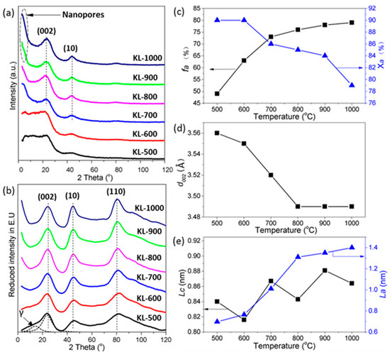 X-ray diffraction (XRD) analysis of KL-X samples: (a) wide angle (2θ = 3~120°) XRD patterns; and (b) reduced intensity XRD patterns; (c–e) the influence of heating temperature on the structural parameters of KL-X samples; (c) aromaticity fa and amorphous carbon fraction Xa; (d) interlayer spacing d002; and (e) nanocrystallite lateral size La and thickness Lc.