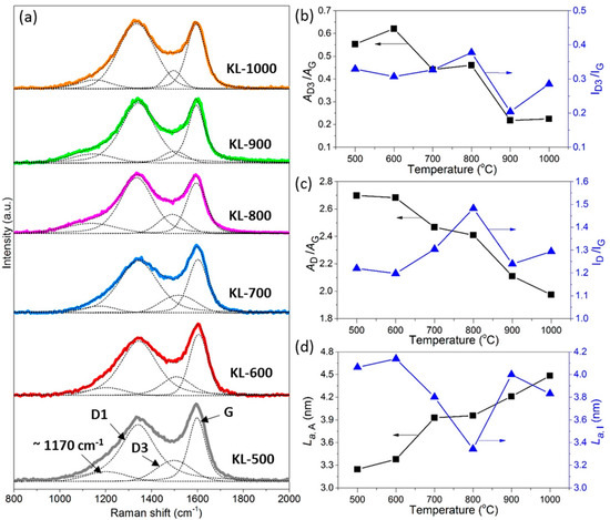 In general, the calculated values of AD3/AG and AD/AG had a decreasing trend as temperature increased from 500 to 1000 °C, while there was no predictable pattern in how temperature affected ID3/IG and ID/IG values (Figure 4b,c). The average decreasing rates of AD3/AG and AD/AG were 6.6 × 10−4/°C and 1.46 × 10−3/°C from 500 to 1000 °C. These decreases confirmed the reduction of the amorphous carbon fraction [47] and the increased structural ordering of the KL-X samples [48]. The calculated La-A values increased with the rise in temperature from 500 to 1000 °C, however, there was no increasing trend observed for La-I values with the rise of temperature (Figure 4d). The increasing trend of La-A values matching to XRD results suggested that AD/AG is more suitable for calculation of La than ID/IG when used for KL-X samples’ structure parameter calculation. This observation was different from the report from Cançado et al. indicating that ID/IG is more suitable for La calculation than AD/AG for disorder carbon materials [31].
