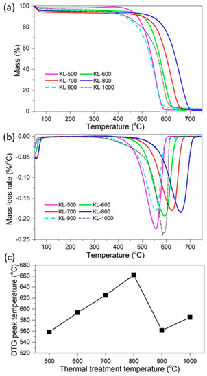 The DTG peak temperature of KL-X samples was plotted versus the thermal treatment temperature of KL samples (Figure 6c). As the thermal treatment temperature of lignin increased from 500 to 800 °C, the DTG peak temperature increased from 558.4 to 662.1 °C, suggested the thermal stability of KL-X samples increased with the rise of temperature from 500 to 800 °C. This was because KL-X samples treated at a higher temperature contained less amorphous carbon. KL-900 and KL-1000 samples had lower DTG peak temperatures than KL-800, KL-700, and KL-600 samples, suggesting that KL samples treated at a higher temperature were less stable for thermal oxidation if compared to a lower temperature. This phenomenon can be attributed to KL-900 and KL-1000 containing more nanopores in their structures, as described in our XRD results. Xie et al. reported that carbons in organosolv lignin treated at 1000 °C contained a significantly higher amount of nanopores (2~75 nm in diameter) than those treated at 700 °C [41]. Aso et al. reported that carbons derived from heat treating polyvinyl chloride (PVC) and polyfurfuryl alcohol (PFA) at 1000 °C had a lower oxidative decomposition peak temperature than those at 900 °C [25]. Ruiz-Rosas et al. investigated the oxidation resistance of lignin-based carbon fiber with and without platinum, they found carbon fiber without platinum produced at the temperature of 1000 °C had lower oxidation resistance than that of 900 °C, and this was because of the development of nanopores and surface area at 1000 °C [15]. Besides, the presence of platinum decreases the oxidation resistance of lignin-based carbon fiber because platinum widened the nanopore structure of carbon fiber [15]. KL is an oxygen-rich aromatic compound compared to PVC and PVA materials. Therefore, more nanopores can be developed during thermal treatment. In addition, the presence of inorganic ash in KL can also lead to the development nanopores at high temperatures (900 to 1000 °C).