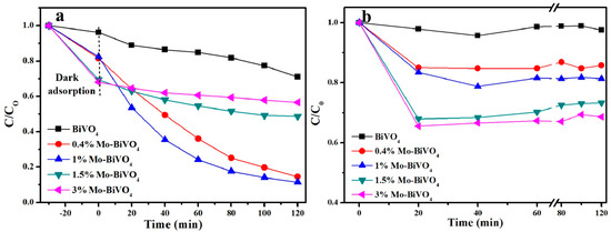 (a) Photocatalytic degradation of MB using undoped BiVO4 and different amount of Mo-doped BiVO4 under visible light (λ > 420 nm) illumination; and (b) adsorption properties of the five products above.